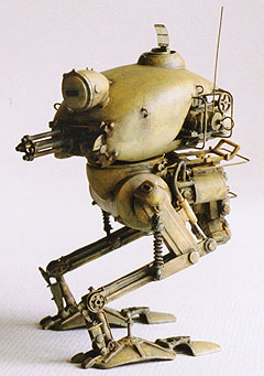 マーキング類は、散々悩んだ挙句ナニもナシにしてしまった。けどちょっと寂しいので、部隊マークと車体番号くらいは入れてみよう。 エンジンや関節周辺には、艶ありのコゲ茶でグリスの表現。これが意外とハマったかも。 例によって写真では分かりにくくてすんま損。 やはり小スケールの模型は「細かいとこをこれでもか!と作り込む/塗り分ける」に限ると思います。 写真だけ見せて「え?これって大きさはどの位なの?」と思わせることができたら、 してやったりだと思うワケなのです。 |