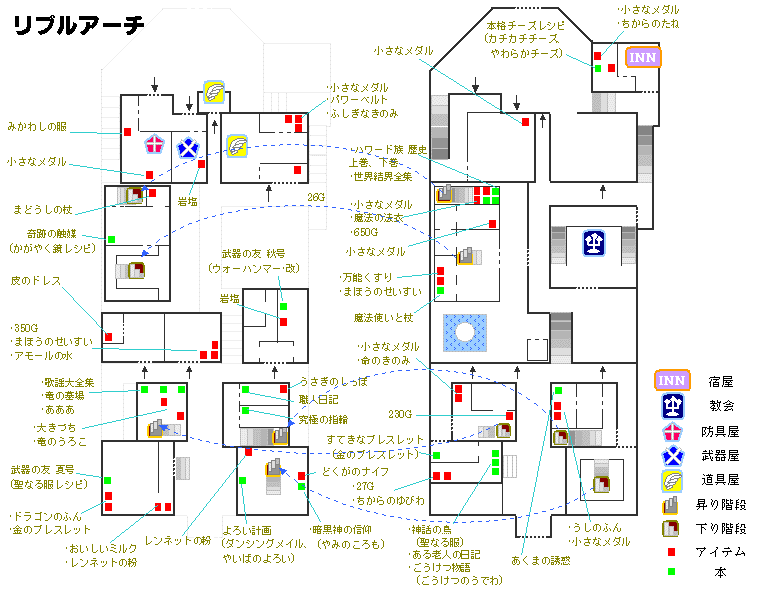 | ドラゴンクエスト8の町、リブルアーチについて解説。アイテムや本棚についてありかを記載。 |