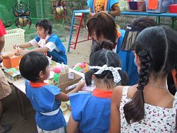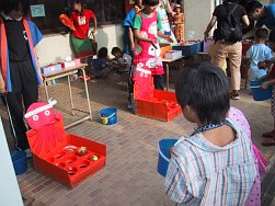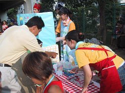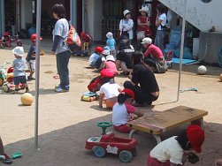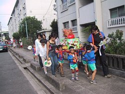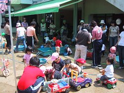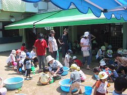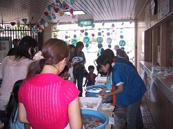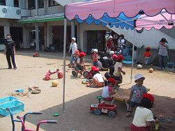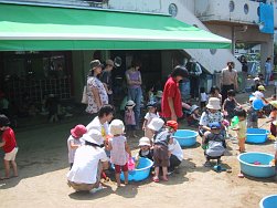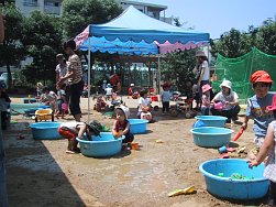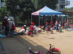 3〜5歳児のクラスもこの日のために頑張って作ったおみこしを担ぎ、0〜2歳児のクラスも自分たちのうちわを持ち元気に近隣を練り歩きました。おおみこしの次は、園庭にて模擬店を行いました。内容は、ジュース、あてもの、かき氷、無料ゲーム、ミルクせんべい、食べもの、水槽ゲームでした。