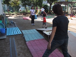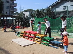 晴天の下9組のみなさんが参加しました。園庭にカラー平均台や太鼓橋、戸板で作った坂道など公園にはない遊具で遊びました。
